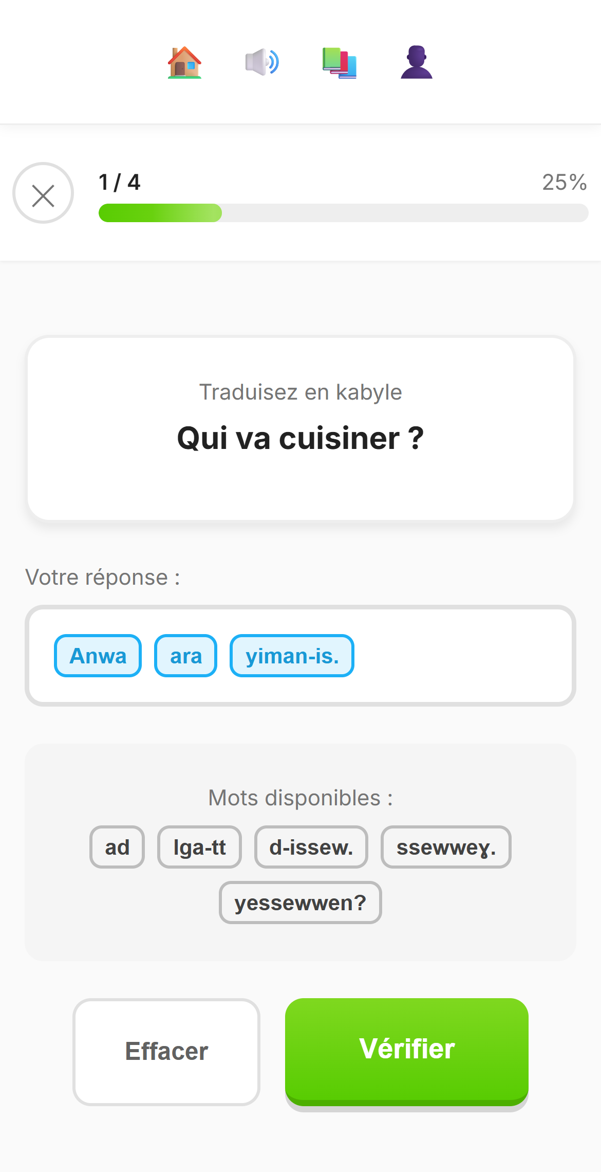 Progressez à votre rythme. Gagnez des points d'expérience à chaque leçon terminée, franchissez les paliers et prouvez votre maîtrise du kabyle.